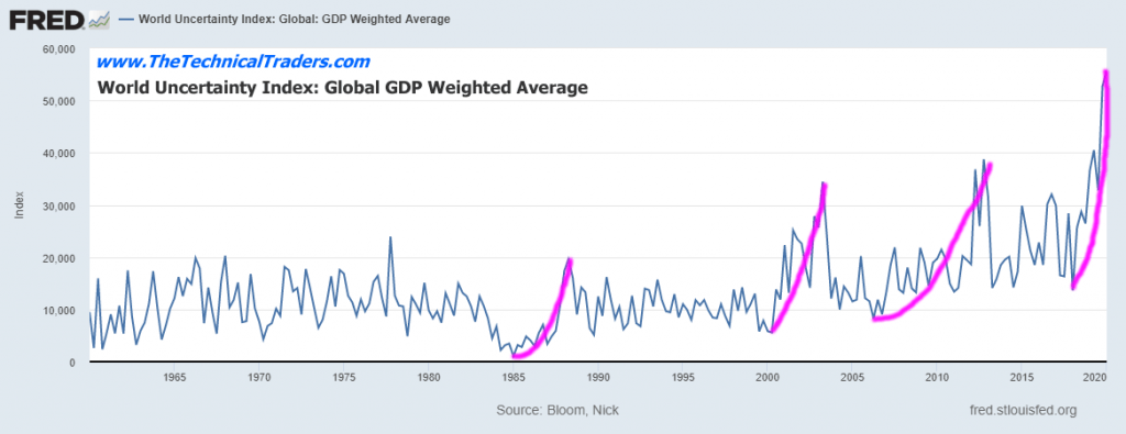 Bay very close attention to the peaks in this index and the dates of these peaks (2004, 2013, 2020). The 2004 and 2013 peaks occurred roughly 3 to 4 years after a major stock market bottom setup. The current index high would suggest a market bottom may have set up in 2016 and a peak in this Uncertainty index may still be 12 to 24 months away. This suggests we may still experience a moderately high degree of uncertainty and a number of unknown global and economic crisis events over the next 12 to 24 months.