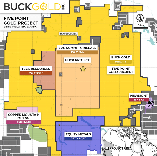 Buck Gold is a privately held exploration company headquartered in Vancouver, British Columbia which controls approximately 1,200 square kilometres (~296,000 acres) of mineral properties located near Houston, British Columbia. The mineral properties controlled by Buck Gold are contiguous to area-holdings of Newmont, Teck and Copper Mountain Mining, and surround Sun Summit Mineral Corp.’s Buck deposit, which has been generating significant market attention through recent drill intercepts.