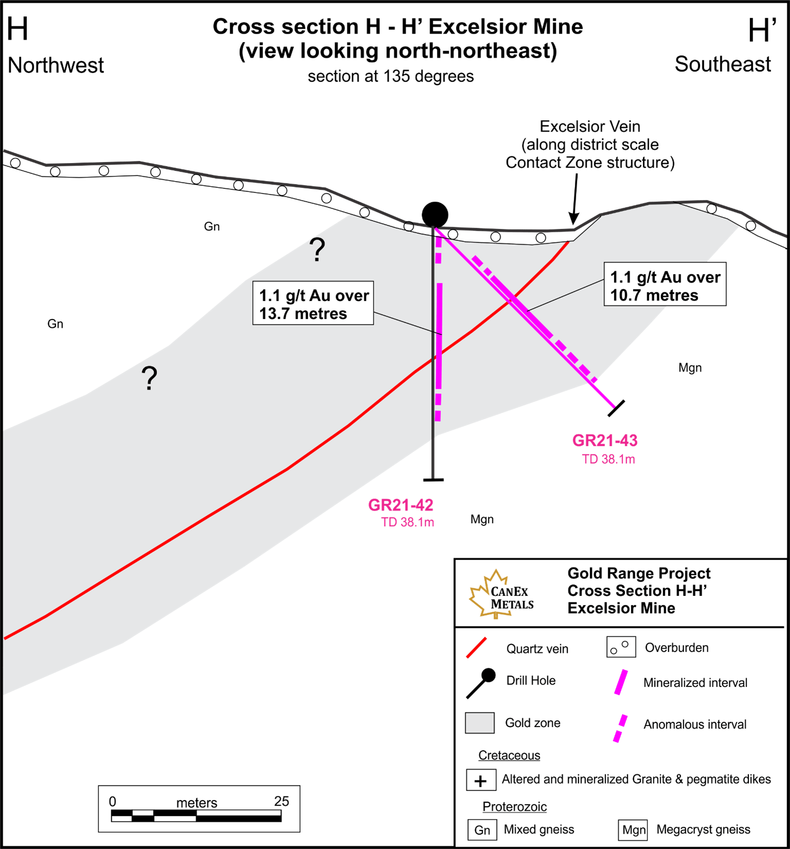 Holes GR21-40, 41, 44 and 45 all tested the middle portion of the Excelsior area and all holes returned strong mineralization as summarized in table 1. Hole GR21-45 intersected 1.1 g/t gold over 19.8 metres starting at 29 metres depth including 1.8 g/t gold over 10.7 metres . Holes GR21-42 and 43 were the northern most test of the Excelsior zone and both returned strong mineralization demonstrating the system is open for expansion to the northeast. Due to access constraints both holes GR21-42 and 43 were collared close to the Excelsior Vein and tested a limited portion of the hangingwall of the system.