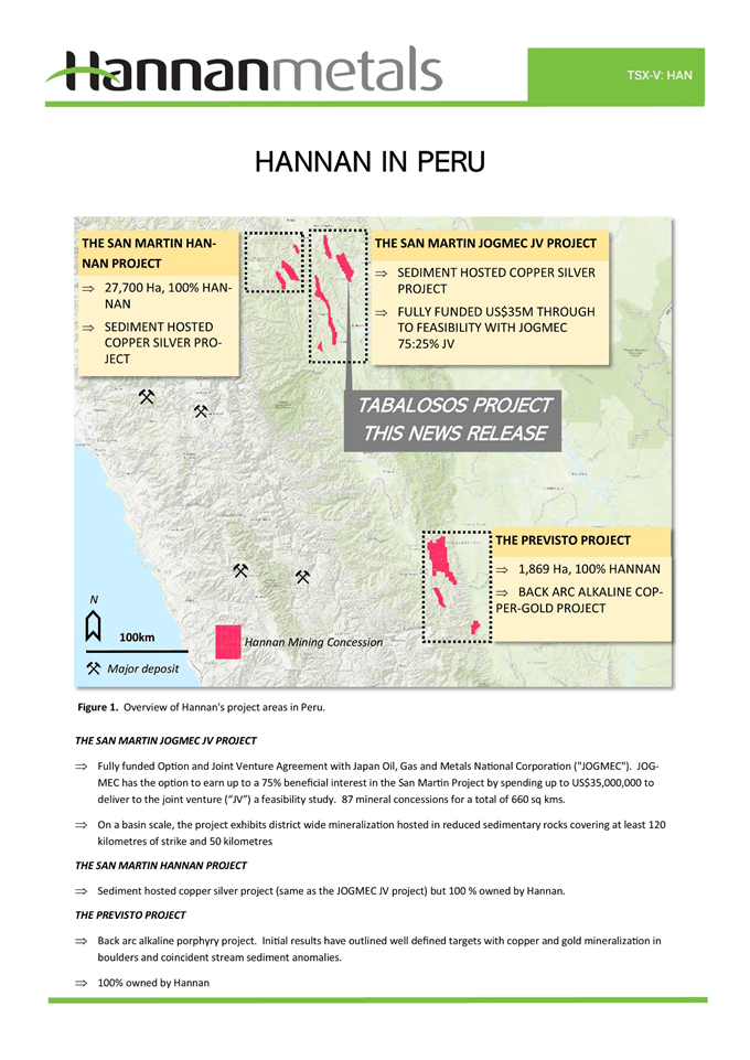VANCOUVER, BC / ACCESSWIRE / June 17, 2021 / Hannan Metals Limited (“Hannan” or the “Company”) (TSXV: HAN)(OTC PINK:HANNF) reports on the results from the soil geochemical sampling program from the Tabalosos East prospect within the San Martin JOGMEC JV sediment-hosted copper-silver project in Peru (Figures 1 and 2).