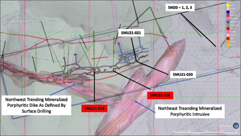Exploration diamond drill hole SMUG21-19 was drilled at 0-degree dip or flat and was designed to test the southeast extension of the main intrusive dike, currently being drilled from surface, before the projected interception with the northeast trending dike as discussed in SMUG21-18 above, see Figure 1.