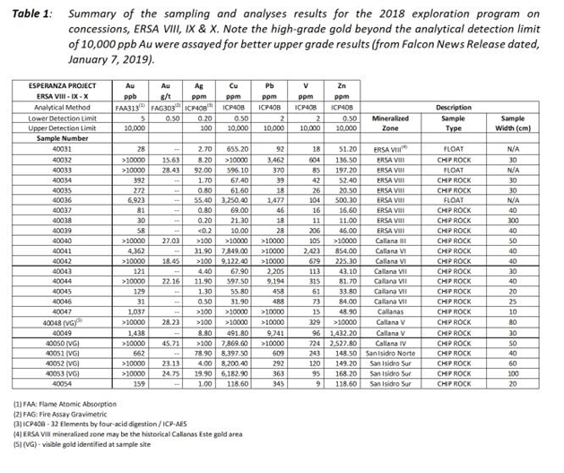 On Jan. 7, 2019, Falcon completed its first exploration work on the Esperanza property and reported on its findings. High-grade gold mineralization is reported to be localized along northwest-southeast striking linear structures. The Callanas area contains several known veins and Falcon’s sampling included a 50cm wide chip sample with visible gold that assayed 44.90 grams per tonne (“g/t”) Gold; 123.2 g/t Silver; 0.73% Copper and another 50cm chip sample that assayed 26.07 g/t Gold; 424 g/t Silver; 1.23% Copper.