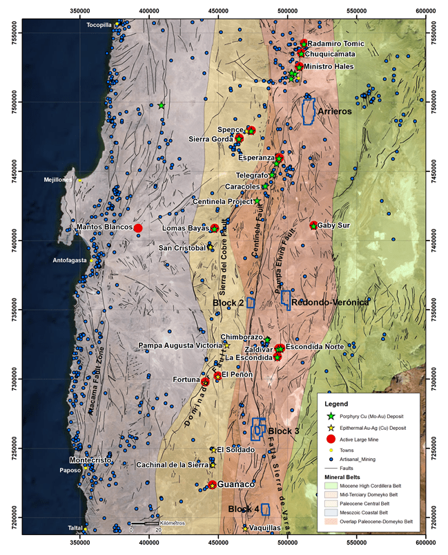 Pampa Metals’ Block 4 project is located along the Cordillera de Domeyko Porphyry Copper Belt in northern Chile, which is host to some of the world’s largest copper deposits and mines. The property is located along a highly prolific segment of this Andean mineral belt, centred along trend some 110 km south of the giant La Escondida – Zaldivar copper mining district and 115 km north-northeast of the El Salvador copper mine.