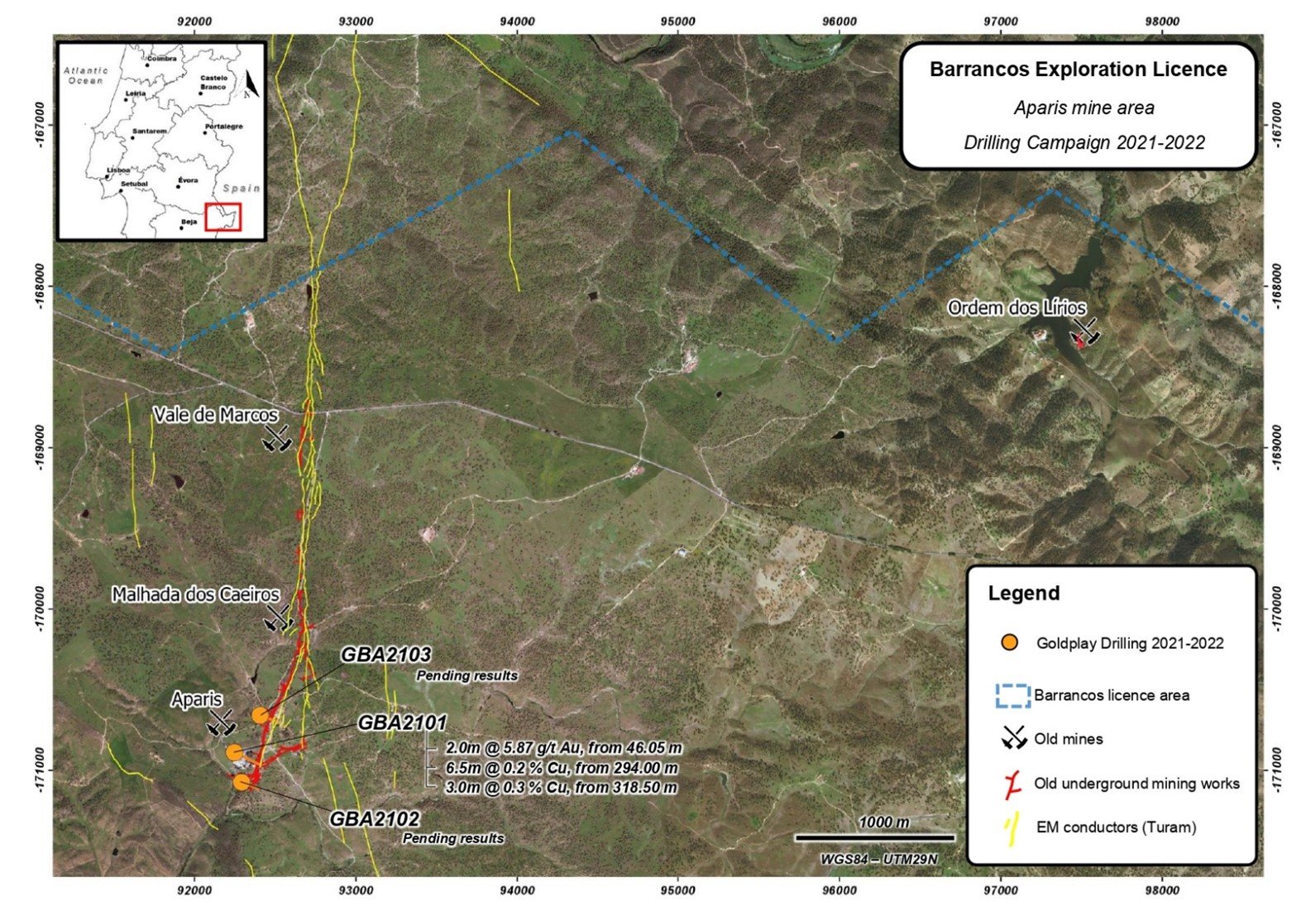 Goldplay has completed an initial drilling campaign comprised of three diamond drill holes totaling 824 m at the past producing Aparis mine located in in the town of Barrancos, Portugal. The objective of this initial drilling program was to expand and better define the known mineralization and to evaluate the Project’s upside potential.