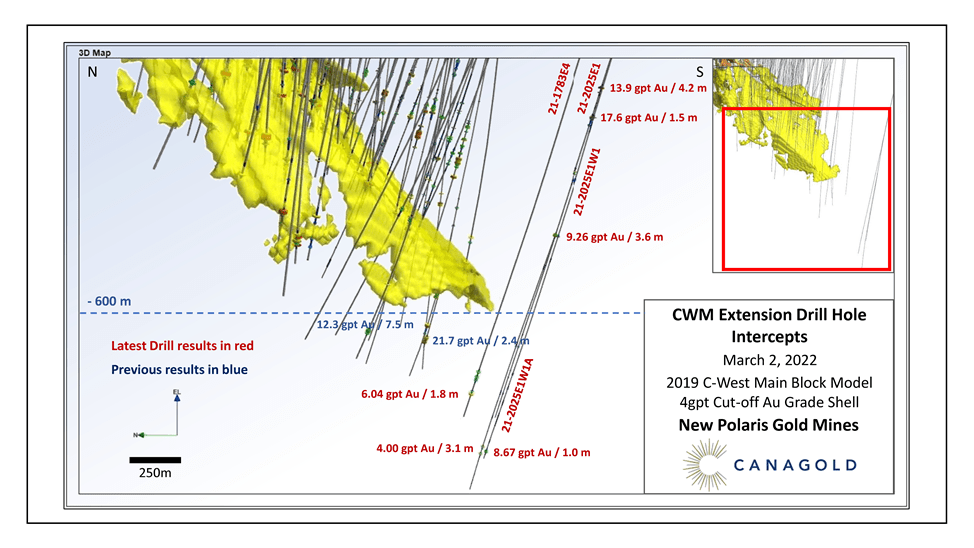 VANCOUVER, BC / ACCESSWIRE / March 2, 2022 / Canagold Resources Ltd. (TSX:CCM)(OTCQB:CRCUF)(FSE:CANA) announces that recent drilling has intersected a deep extension of the C-West Main Vein and discovered a new high-grade C-vein at the 100% owned New Polaris project located in northwestern BC, 100 kilometers (km) south of Atlin, BC and 60 km northeast of Juneau, Alaska.