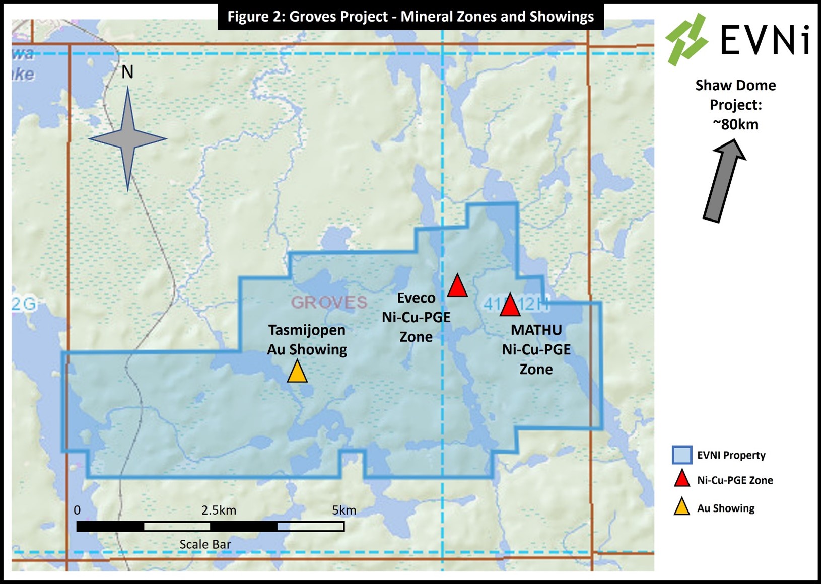 Located approximately 6 kilometres southeast of the Town of Gogama, Ontario in the Porcupine Mining Division (see figure 1), the Groves Project was acquired by EVNi in April 2022 (see press release dated April 4, 2022) and incorporates multiple zones and showings, including the previously identified Mathu showing (see press release dated December 7, 2015 by Northern Sun Mining Corporation).