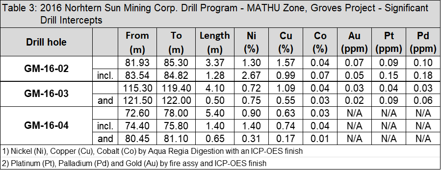 - Hole GM-16-02: 3.37 metres grading 1.87% Ni and 0.75% Cu;