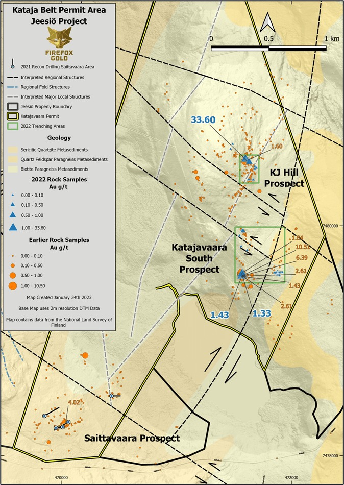 The 2022 trenching campaign was focused on the KJ South and KJ Hill prospects, which emerged from FireFox reconnaissance work in 2019 and 2020. The team excavated 9 small exploration trenches and collected 68 chip/channel and 34 grab samples from bedrock. In summary, approximately 68% of the total samples exceeded the detection limit for the method (0.005 g/t gold), and 15% of the samples contained anomalous levels of gold more than 0.100 g/t gold. Channel samples were taken perpendicular to observed mineralized veins and structures to represent true width. Most anomalous gold samples were hosted within quartz veins and lenses. The team recorded detailed information on the geology, alteration, veining, and structures from the trenches that will guide future work and drilling on these emerging targets.