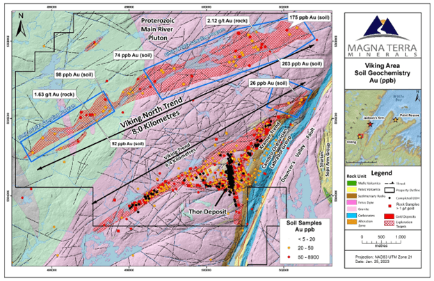 TORONTO, ON / ACCESSWIRE / January 25, 2023 / Magna Terra Minerals Inc. (the “Company” or “Magna Terra”) (TSXV:MTT) is pleased to announce results of a gold geochemical sampling program (“Exploration Program”), as announced on October 12, 2022, at its flagship 100%-owned Great Northern Project (“Great Northern” or the “Project”), located in western Newfoundland. Great Northern is a proven gold environment with existing Mineral Resources and numerous untested gold trends over a cumulative 30+ kilometre strike with the potential to host multi-million-ounce gold deposits.