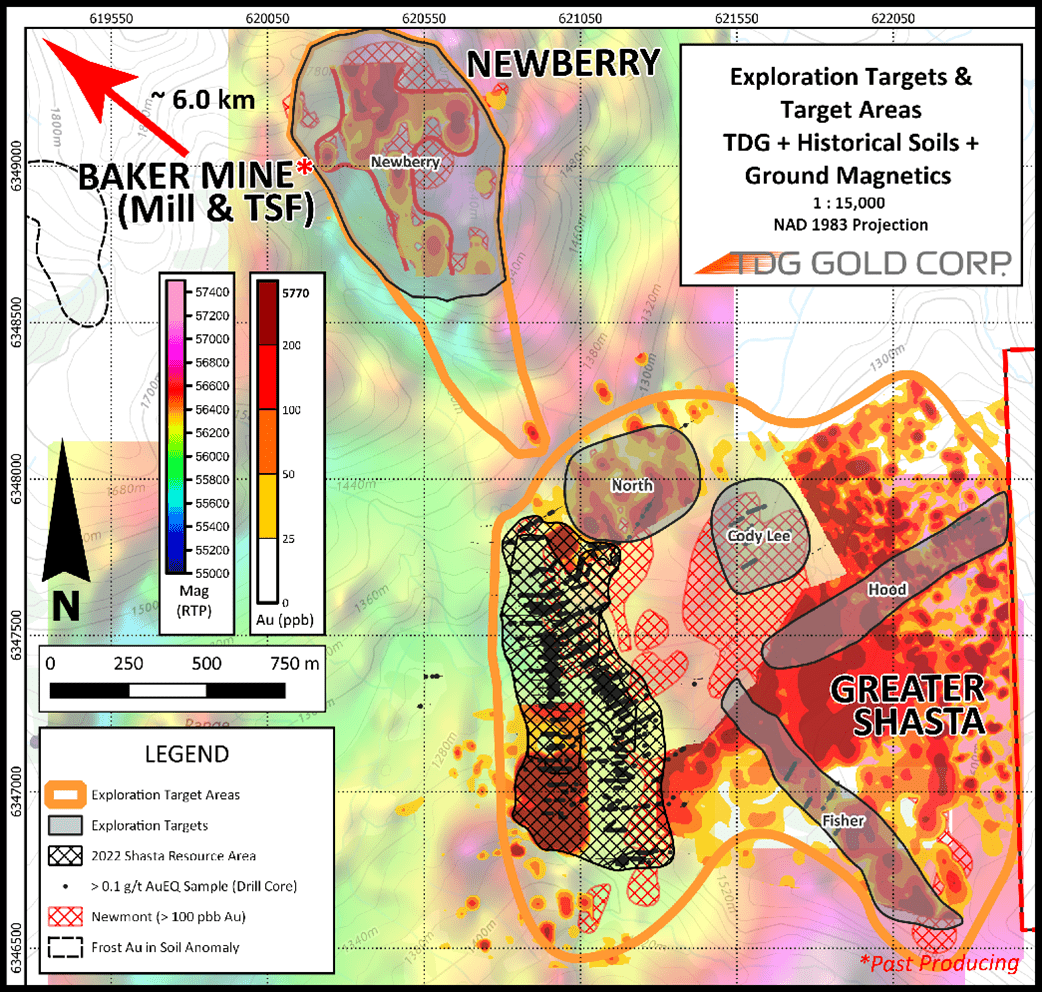 WHITE ROCK, BC / ACCESSWIRE / January 25, 2023 / TDG Gold Corp – (TSXV:TDG) (the “Company” or “TDG”) has outlined five high-priority, drill-ready exploration targets within the Greater Shasta and Newberry areas that are in addition to the Shasta deposit where TDG has defined a mineral resource. The Newberry and Greater Shasta exploration targets are located approximately 6 kilometres (“km”) southeast of TDG’s former producing Baker mine, mill and tailings storage facility, which are road accessible via TDG’s Baker mine road.