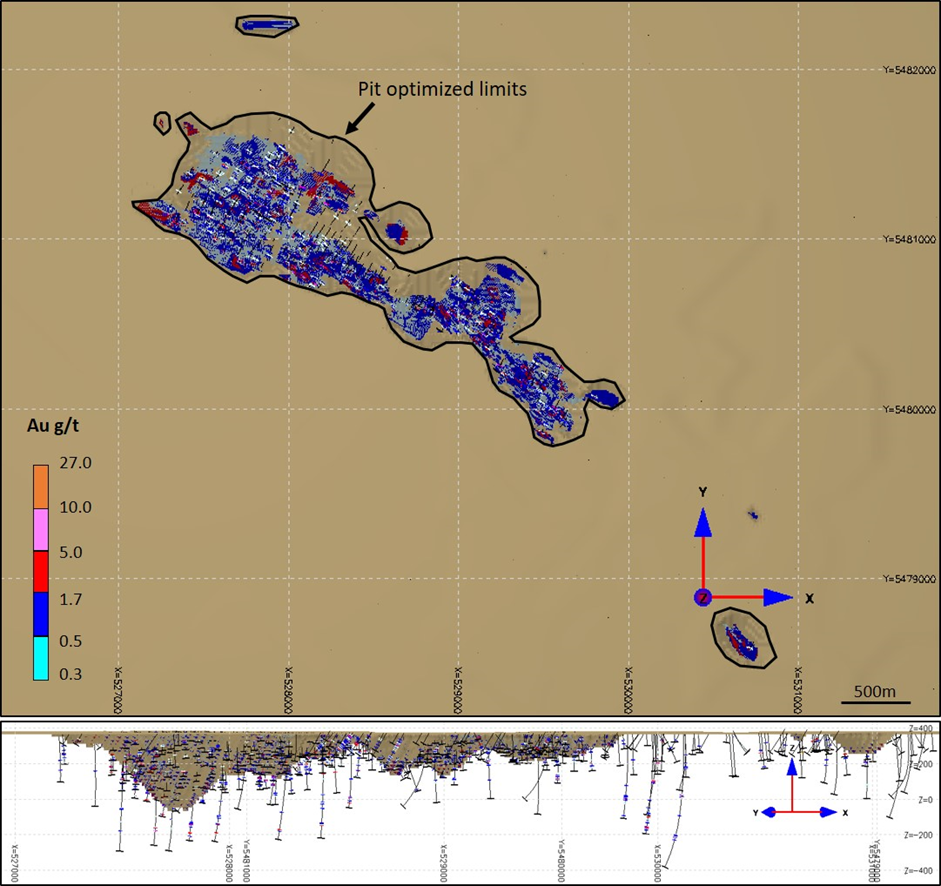 - The pit-constrained resources were based on the following parameters: mining cost 3.25$/t, processing, transport + G&A costs $15/t, Au recovery 93%, bedrock slope angle of 45 degrees.