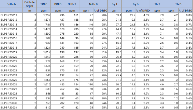- Prospective Grades: The drilling results shows the potential for high Total Rare Earth Oxides[2] (“TREO”) with average grades at 1,229 ppm. From an average drilling depth of 7.2 meters, 71.2% of the drillholes include 5.7 meters with TREO average grades at 1,367 ppm and Desorbable Rare Earth Oxides[3] (“DREO”) at 449 ppm. A selection of high-grade drillhole results are shown in Table 1 below, with the full set of results included in Table 3 at the end of the document.