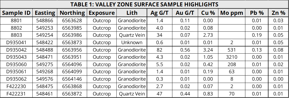 At the Valley Zone, a series of sheeted mineralized porphyry veins and fractures hosted in altered granodiorite have been mapped and sampled over a 1-kilometer east-west trend which returned up to 3.24% Cu (with 82g/t Ag, 0.56g/t Au and 0.053% Mo) and 0.32% Mo (with 1.03% Cu, 4g/t Ag) in 2022, and 0.83% Cu, 47g/t Ag, 0.44g/t Au and 0.007% Mo in 2024 (Figure 1, Table 1).