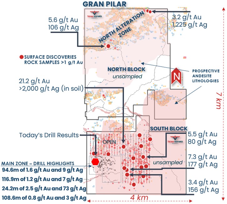 CALGARY, AB / ACCESS Newswire / April 16, 2025 / Tocvan Ventures Corp. (the “Company“) (CSE:TOC)(OTCQB:TCVNF)(WKN:TV3/A2PE64), is pleased to announce the remaining results from core drilling at the Gran Pilar Gold Silver Project in mine-friendly Sonora, Mexico. Ten core drillholes totaling 1,167.5 meters were completed earlier this year within the majority owned (51%) Main Zone held in partnership with Colibri Resource Corp. Today’s results are highlighted by 7.2 g/t Au and 80 g/t Ag over 2.6 meters, within a mineralized zone that averages 0.5 g/t Au over 46.9 meters starting from 54.5 meters downhole (drillhole JES-25-112). Drill hole JES-25-112 is located 70 meters south of past drill hole JES-22-62, which returned 108.9 meters of 0.8 g/t Au (see April 26, 2022 News Release). Mineralization is hosted in a stockwork of quartz veining, with high grade zones associated with shear zones with quartz andiron oxides filling fractures. JES-25-112 marks the southern most successful hit of significant mineralization to date, the trend remains open to the south. A core duplicate sample through the high-grade zone returned 18 g/t Au over 1.1 meters, the original sample returned 4.4 g/t Au. The variance has been noted as a product of coarse gold in the system. The Company is evaluating additional studies to determine the impact of high-grade variance on resource estimation. Hole JES-25-111, located 450 meters northeast of the Main Zone, within the 4-T Trend returned an anomalous zone of gold and silver that included 0.7 meters of 0.8 g/t Au and 24 g/t Ag. Hole JES-25-110 located 300 meters from the Main Zone, within the North Hill Trend returned an anomalous zone that includes 7.8 meters of 0.1 g/t Au. Intervals reported are drilled widths, true estimated widths are not known at this time.