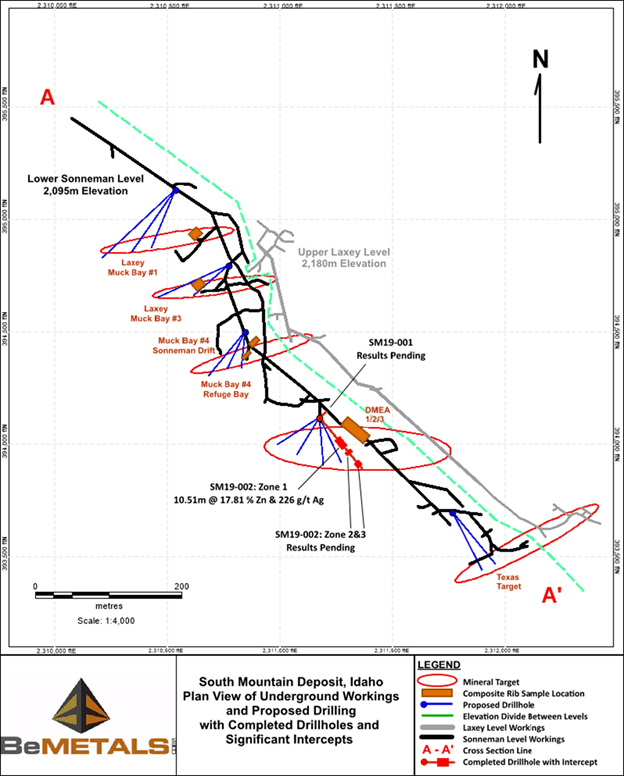 John Wilton, President, CEO and Director of BeMetals stated, “These initial results confirm the high-grades associated with the polymetallic South Mountain deposit and emphasize the significant precious metal component to the mineralization. We are pleased with this first drill intercept and thus far, the underground drilling program has been successful in testing the nature and potential of the down plunge mineralization. Borehole SM19-002 has returned a drilled core length intercept of 10.51 metres with a grade of 17.81% Zn, 226 g/t Ag and 2.41 g/t Au. In addition, this borehole encountered two other significant intersections of massive sulphide mineralization, and results are pending for those remaining zones. The massive sulphide mineralized zones are hosted dominantly within the skarn mineral assemblage.