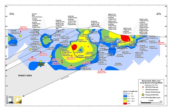 Nine holes were completed to specifically target down-plunge, down-dip and along-strike extensions of the mineralization. This drilling was successful in extending the Barani East Zone down-plunge a further 90 metres, at least another 50 metres to depth on six sections and a further 250 metres along strike (see Figures 2 and 3), with all holes drilled outside of the current resource pit (Indicated Mineral Resource of 45,250 ozs gold grading 1.99 g/t gold and Inferred mineral resources of 73,170 ozs gold grading 2.15 g/t gold – NI 43-101 compliant resource report filed on SEDAR, 2014). This work suggests that the Barani East Zone is shallower plunging than previously believed and as such, additional holes are proposed (see Figure 2) to further test the inferred higher-grade portion of the zone at shallower depths, especially down plunge of a 2018 hole that returned 6.3 g/t gold over 13 metres. To date, the central, 450-metre long portion of the zone has been tested to 150 to 200 metres depth with the remaining holes generally testing to less than 100 metres depth. Recent highlight drill intercepts include 1.49 g/t gold over 23.7 metres including 2.87 g/t gold over 4.8 metres and 4.49 g/t gold over 2.85 metres. Gold mineralization is related to a northeast-trending, cross-cutting structure with altered limestone, siltstone, granite and mafic intrusions hosting the gold.