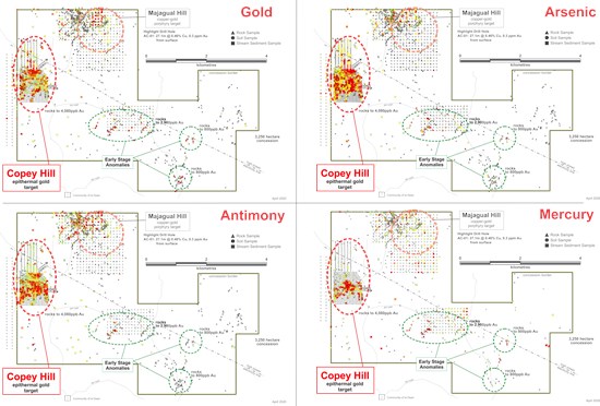 Project work completed by past operators includes both property-wide reconnaissance scale exploration and detailed follow up work on two of the three surface geochemically anomalous zones identified on the Project. The three notable exploration zones are (i) Copey Hill, an epithermal gold target, (ii) Majagual Hill, a copper-gold porphyry target (tested in 2017 with five diamond drill holes) and (iii) a broad area of early stage rock and stream sediment anomalies, which require follow up investigation.
