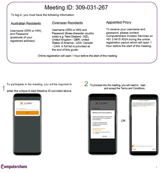 Upon entering the Lumi platform, shareholders will be required to enter the Meeting ID: 309-031-267 and their SRN or HIN to participate. (Please note: if you have multiple holdings you will either need to log into Lumi under each SRN or HIN to vote live in the meeting, or cast your vote on other holdings ahead of the meeting via www.investorvote.com.au or by returning your proxy form before 8:00am on 25 May 2020.