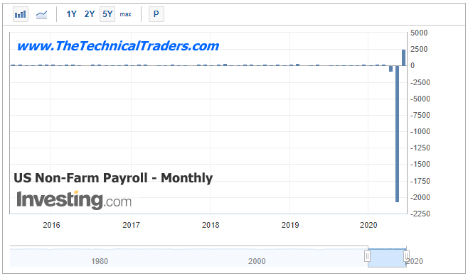 As you can see from this Weekly Jobless Claims chart, below, the spike in new jobless claims happened in early April 2020 with 6.86 million new jobless. Since then, the number of new jobless has continued at levels greater than 2 million per week and have slowly been decreasing. We are aware that many states are reducing state and educational employment budgets as a result of the COVID-19 virus event. These budget cuts and layoffs may continue throughout all of 2020 and into 2021 unless a strong recovery event takes place before the end of 2020.