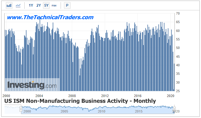 The current economic data does not support a US stock market rallying to new all-time highs – unless you attempt to account for investor over-enthusiasm and exuberance. The business activity data over the past few months have shown the deepest decline over the past 20+ years. There has never been a print of this indicator below 30, ever, except April 2020. Even at the height of the 2008-09 housing/credit market crisis or the 911 terrorist attacks, US businesses continued to operate at moderate levels.