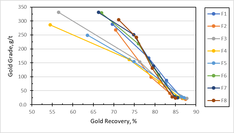 Figure 2: Gold grade-recovery curves for the 2020 laboratory flotation tests