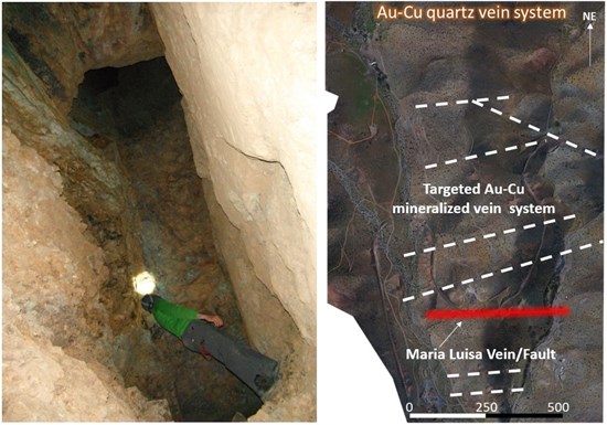 The Maria Luisa project hosts gold-copper mineralization in two major NW and NS trending strike-slip structural systems. Historical mining has largely been from the main NW-trending system, the Maria Luisa vein (Figure 1) which is an anastomosing set of structures, traceable for ~500 metres along strike that range from 1-5 metres in width and includes veins, faults, magmatic-hydrothermal breccias, and tectonic breccias. The numerous other structural and vein systems on the project have not been effectively explored and could provide additional upside.