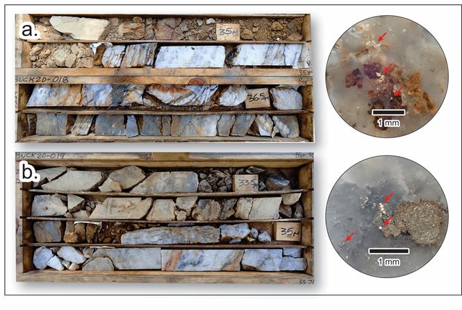 Figure 3: Photograph of quartz vein intervals intersected in HQ-sized diamond drill hole a) BUCK-018 and b) BUCK-19 with examples of visible gold depicted at right, indicated by red arrows. Scale as noted.