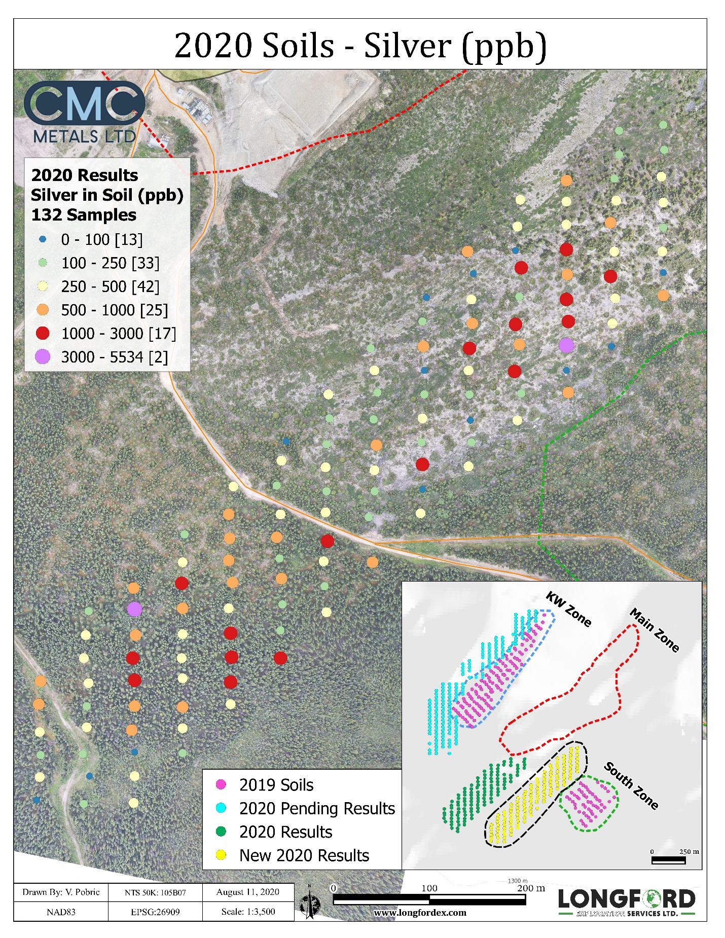 August 12, 2020 – TheNewswire – Vancouver, BC. – CMC Metals Ltd. – (“the Company”) (TSXV:CMB) (OTC:CMCXF) is pleased to announce additional highly anomalous assay results from recent soil sampling in the southern end of the property that may represent an extension of the Main Zone at the Company’s 100% owned Silver Hart Project in Yukon, Canada.