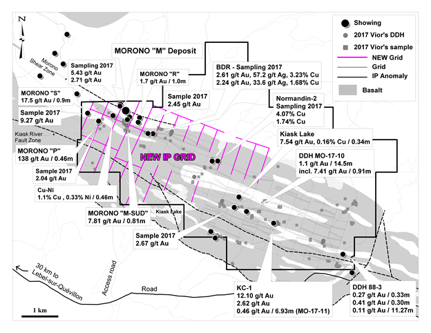 En 2017, Vior avait mis à jour une nouvelle zone aurifère recoupée dans le sondage MO-17-10, qui ciblait une anomalie de chargeabilité de PP située à 800 mètres au nord-ouest et dans l’axe géophysique de l’indice aurifère KC-1, où un échantillon de roches choisi prélevé en surface a donné une teneur de 12,1 g/t (communiqué du 14 mars 2018). L’indice, l’anomalie PP et le sondage sont situés juste au nord et parallèles à la zone de faille de la rivière Kiask, qui traverse la propriété selon un axe nord-ouest/sud-est. Le sondage MO-17-10 a obtenu une teneur de 1,13 g/t Au sur 14,5 mètres (de 40,0 à 56,0 m dans l’axe de forage), incluant 2,93 g/t Au sur 4,53 mètres, y compris un intervalle à 7,41 g/t Au sur 0,91 mètre (les résultats sont présentés en épaisseur réelle). La découverte de cette nouvelle zone aurifère ouvrait un nouveau secteur favorable très prometteur d’une étendue latérale d’au moins 900 mètres, qui demeure largement inexploré et ouvert dans toutes les directions.