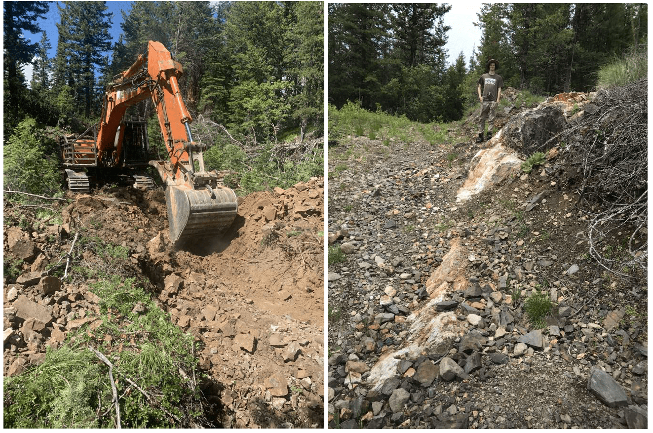 Photos of excavator at Roderick Dhu (left) and vein exposed in previous trench at Gold Drop (right)