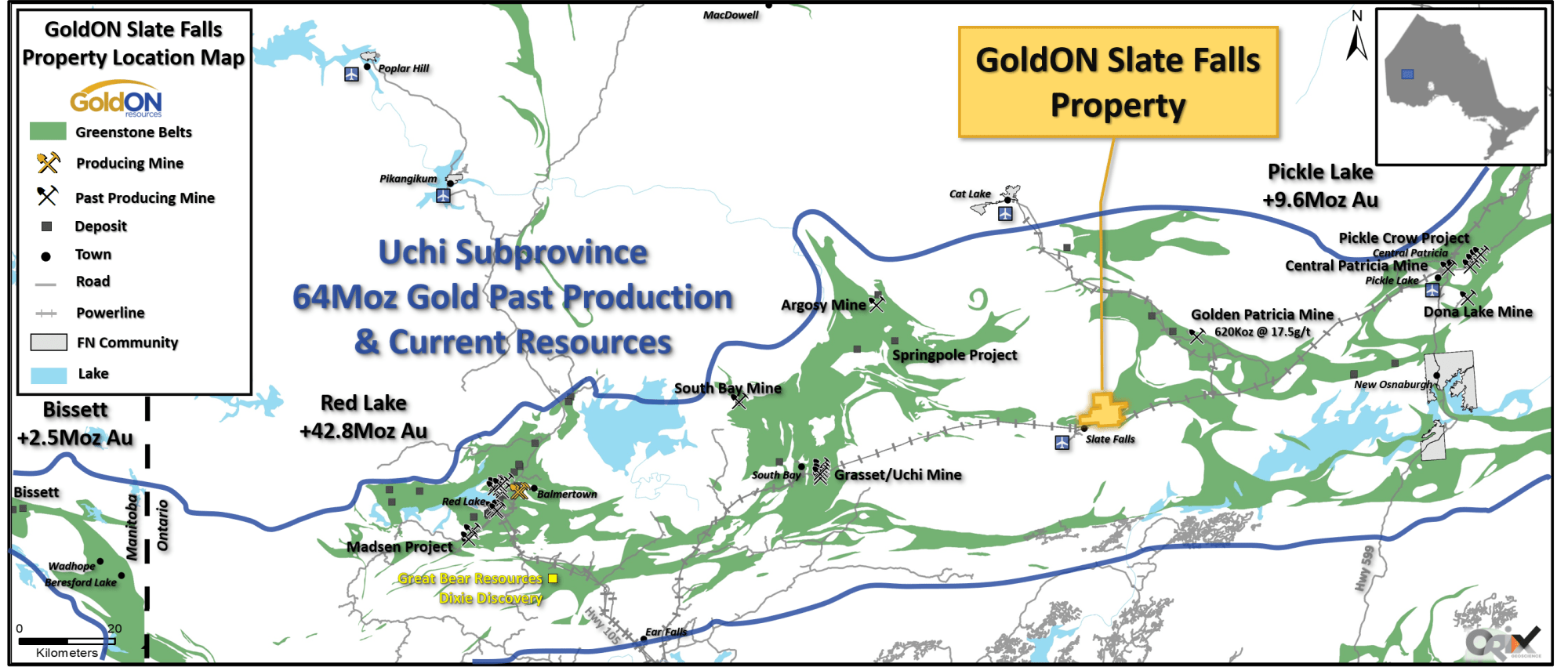 VICTORIA, BC / ACCESSWIRE / August 13, 2020 / GoldON Resources Ltd. (TSX-V:GLD) (“GoldON” or the “Company”) is pleased to provide an overview of the geological data compilation and reinterpretation study completed on its 100% owned Slate Falls gold-silver property (the “Property”) by Orix Geoscience. The 5,656-hectare Property is located in the Patricia Mining Division of northwestern Ontario and lies within the southwestern extension of the Meen-Dempster Greenstone Belt between the Red Lake and Pickle Lake gold camps (see Figure 1).