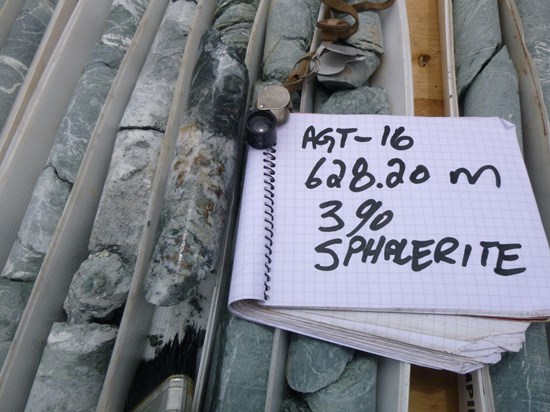Of the four holes drilled to date into the 3500-metre continuous IP chargeability anomaly, drill hole AGT-16 has encountered the best mineralization, including a 10.7 metre sulphide zone. Mineralization in this hole has zones of semi-massive pyrite, containing 15 to 30% pyrite, together with up to 3% sphalerite and some galena (core photos shown below and on company website). The first three holes intersected stacked lenses of disseminated sulphides and are around 3000 metres to the south of AGT-16.