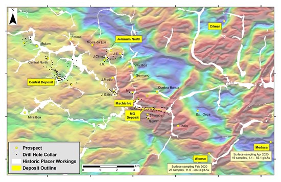 Figure 1: Regional RTP 1VD magnetic map showing location of the Jerimum North target relative to the existing deposits at MG and Central, and the Jerimum North and Machichie SW targets, as well as recently identified high-grade targets at Alonso and Medusa and Cilmar. Surface channel sampling at Jerimum North returned 5.3m @ 24 g/t gold.