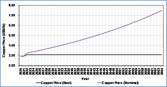 Figure 17. Copper price assumptions for the Kakula 2020 DFS, Kakula-Kansoko 2020 PFS and Kamoa-Kakula 2020 PEA shown on a real and nominal basis.