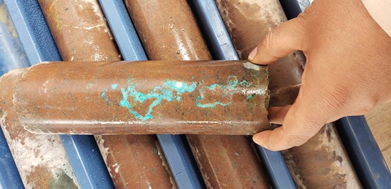 Photo 1. Select HQ Core (Diameter 63.5mm) from DCH-66 Interval 70-75m. Malachite, chrysocolla, and other copper oxides as disseminations and fracture coatings in Chocolate Formation andesite. (This core is not representative of all Los Chapitos Core)