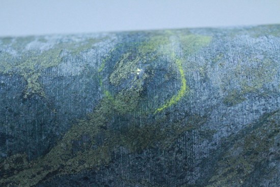 Sample of copper – VG bearing rock from a saw cut at the Del Norte / Lord Nelson tenures boundary (“14 oz” zone).