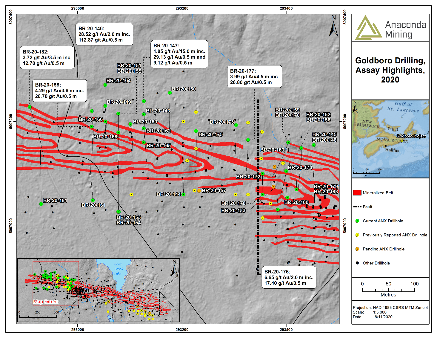 TORONTO, ON / ACCESSWIRE / November 19, 2020 / Anaconda Mining Inc. (“Anaconda” or the “Company”) (TSX:ANX)(OTCQX:ANXGF) is pleased to announce drill results from an ongoing 15,000-metre infill drill program (“Drill Program”) at its 100%-owned Goldboro Gold Project (“Goldboro” or the “Project”) in Nova Scotia, Canada. The Drill Program is designed to convert priority Inferred Mineral Resources into Measured and Indicated Mineral Resources of the Goldboro Deposit as part of the ongoing feasibility study.