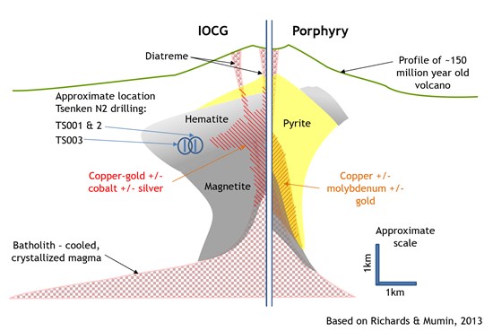 - Drilling is planned for the breccia at Tsenken N1. Breccias are a common feature of IOCG systems and the occurrence of bornite – a copper sulphide mineral that is commonly found in the centre of these systems – at Tsenken N1, is consistent with this being a key target area.