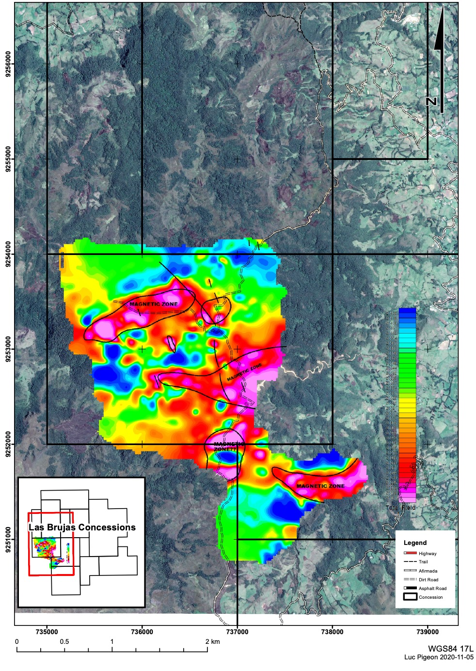 In order to further evaluate the prospectivity of the project area, a ground magnetic survey was initiated on 19 October 2020, to survey the Las Brujas Gold 2 Concession. The survey is expected to cover up to 1,000 hectares. To date over 580 hectares have been surveyed (refer, Figure 2). The initial survey results indicate the presence of at least three magnetic bodies located near the confirmed gold mineralization and appear to correlate with mapped andesitic volcanic and subvolcanic rocks. The gold mineralization appears to be concentrated near the boundaries of the magnetic features, though mineralization is also evident within certain of the magnetic features.