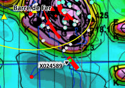 - Sampling of the Syrah occurrence 0.5 km to the east of Barre de Fer yielded 0.36% Ni, 0.18% Cu, and 409 ppm Co hosted in norite-gabbronorite with 3-7% pyrrhotite.