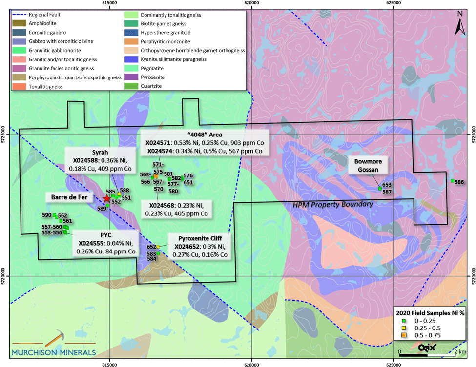 TORONTO, ON / ACCESSWIRE / November 19, 2020 / Murchison Minerals Ltd. (“Murchison” or the “Company“) (TSXV:MUR) is pleased to provide an update on the recent prospecting results on its HPM Ni-Cu-Co project in Quebec. Results of the reconnaissance sampling program completed by Orix Geoscience 2018 Inc. confirm the widespread nature of Ni-Cu-Co mineralization across the HPM project area. Grab sample assay results reach up to 0.16% cobalt, 0.499% copper and 0.526% nickel.