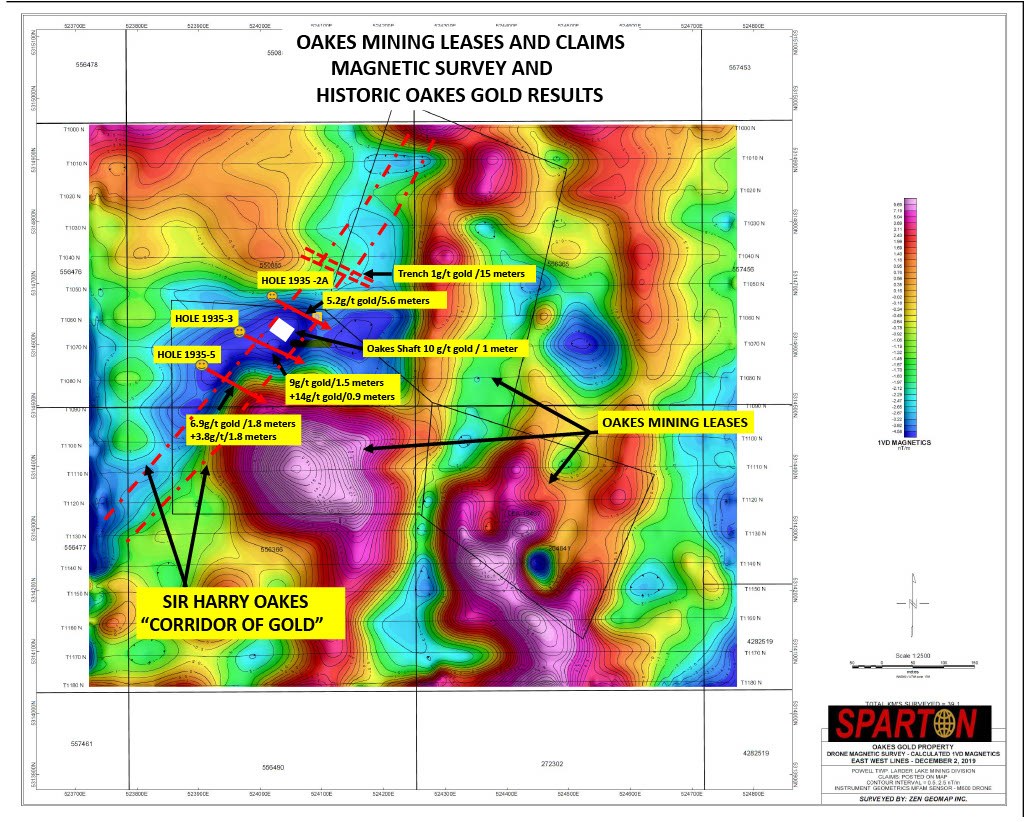 “Sparton completed a detailed drone supported airborne magnetic survey over its entire claim package, including the two claims, where Val-d’Or Mining owns the net smelter royalty. The magnetic data clearly show a magnetic low structure trending N-S down Hawley Lake and the NNE fault from the OGS mapping in 2006-7 marked as the extension of the Galer Lake Fault. It also shows the N-S diabase dykes located in the north trenches B, C and D areas.”