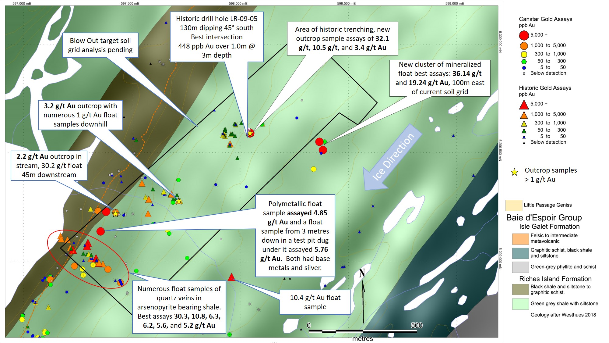 – New assay results confirm high grade gold mineralization at the Blow Out target on the Golden Baie Property in Newfoundland, with float grab samples grading up to 36.14 g/t gold;