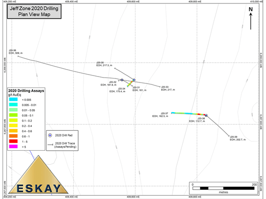 (Figure 3: Plan view of the Jeff target area showing 2020 drill traces and assay flags.)