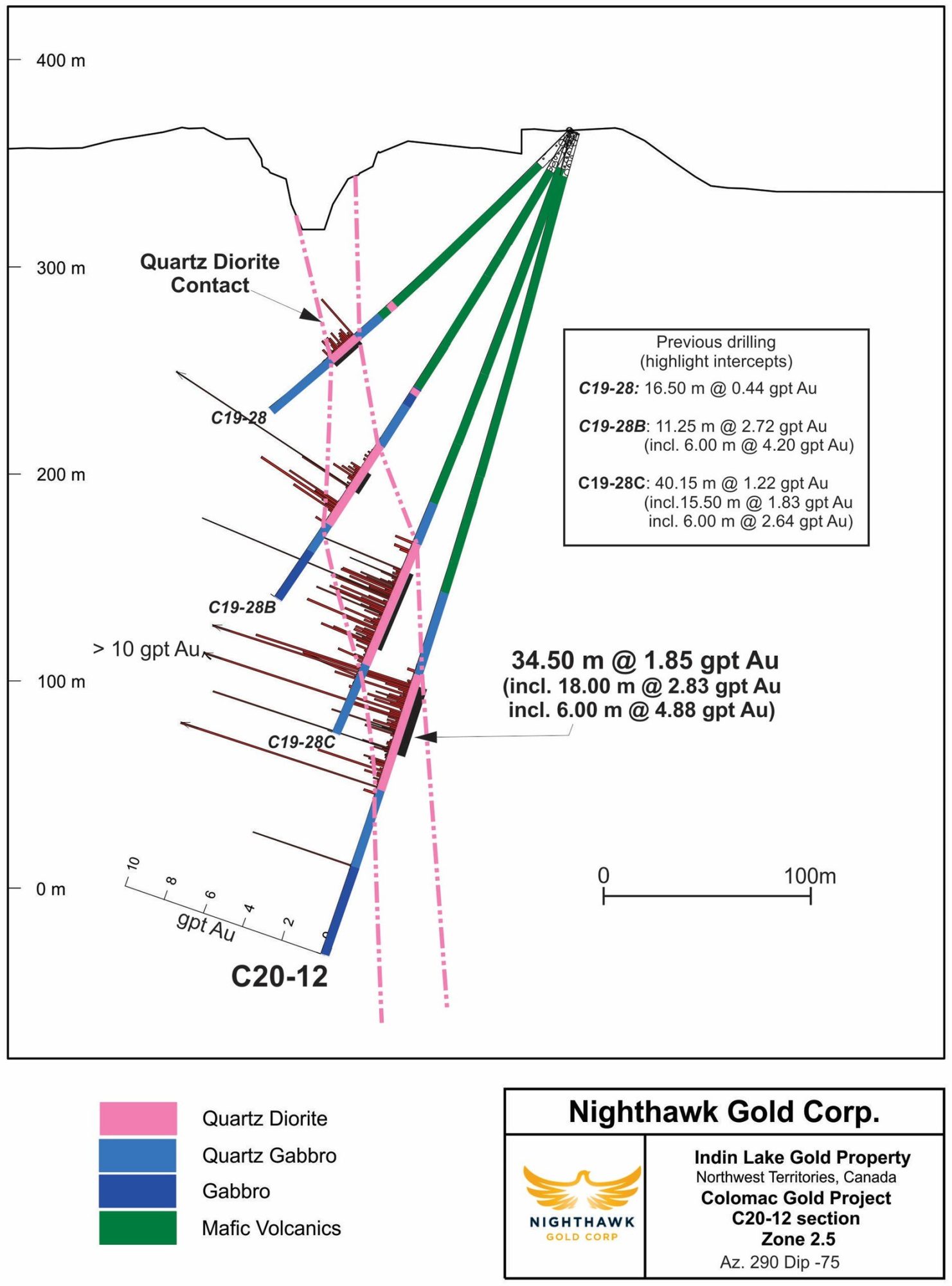 TORONTO, ON / ACCESSWIRE / December 21, 2020 / Nighthawk Gold Corp. (“Nighthawk” or the “Company“) (TSX:NHK)(OTCQX:MIMZF) is pleased to report assay results for four (4) drill holes (1,993metres) completed at Zones 2.0 and 2.5 of the Colomac Main Sill, part of the Colomac Gold Project (“Colomac“) centrally located within its Indin Lake Gold Property, Northwest Territories, Canada (Figure 1; Table 1).