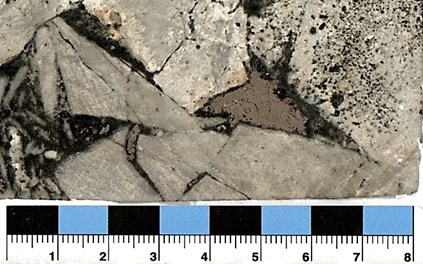 Description: Hydrothermal Breccia mosaic texture, monomictic quartzite angular clasts. Fine tourmaline matrix with pyrrhotite, chalcopyrite, pyrite and +/- sericite.