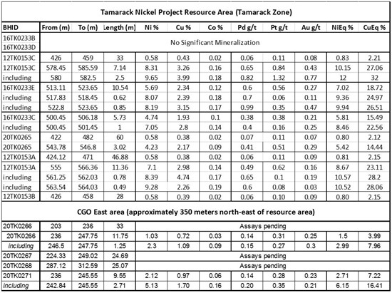 The year 2020 commenced with Talon kicking off its very first drill program as Operator of the Tamarack Nickel Project since taking over operatorship from Kennecott Exploration Company (part of the Rio Tinto group) in late 2019. Over the course of 2020, Talon’s drill programs focused primarily on drilling more massive sulphide mineralization within the Company’s mineral resource area (known as the Tamarack Zone) and stepping 350 meters outside of the Tamarack Nickel Project’s resource area in a new zone (known as CGO East). For a summary of the Company’s drill results, please see Table 1 below.
