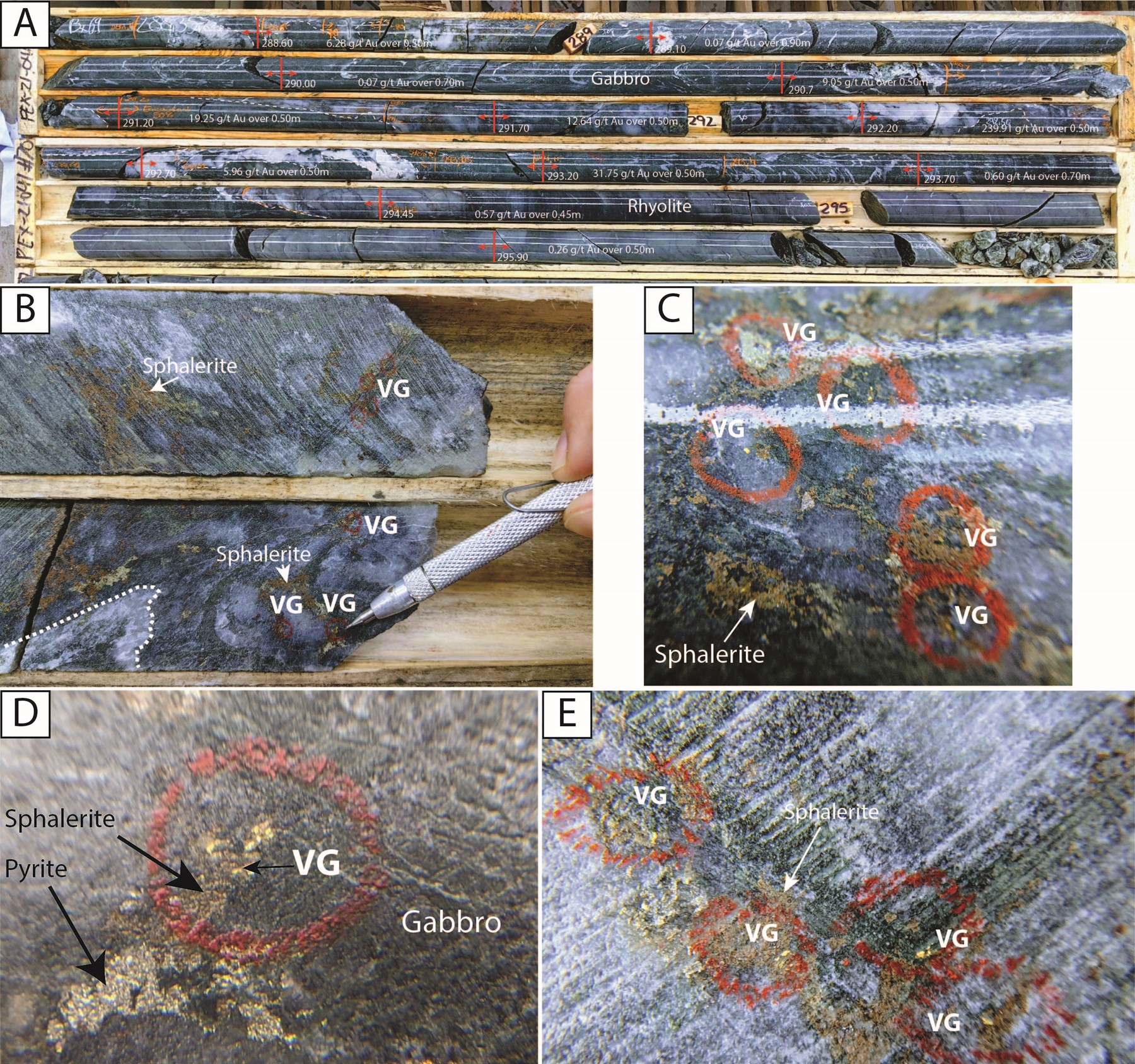 Figure 3: Photography of the Drill Core from PEX-21-041; A) General View of the Intersection with Grade Distribution and Lithology; B) Quartz-Carbonates breccia with Sphalerite, Pyrite and Visible Gold (VG); C) Visible Gold in Association with Sphalerite; D) Visible Gold in Association with Pyrite; E) Visible Gold in Association with Sphalerite. (For enhanced image, click here)