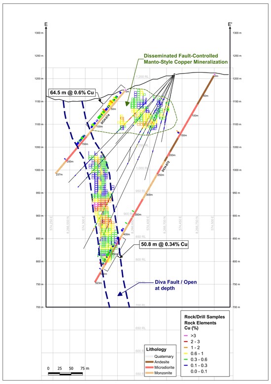 Section DCH-074 (Figure 3) containing drillholes DCH-072 and DCH-074 shows manto-style copper mineralization near surface, and the continuation of the Diva Structure at depth.
