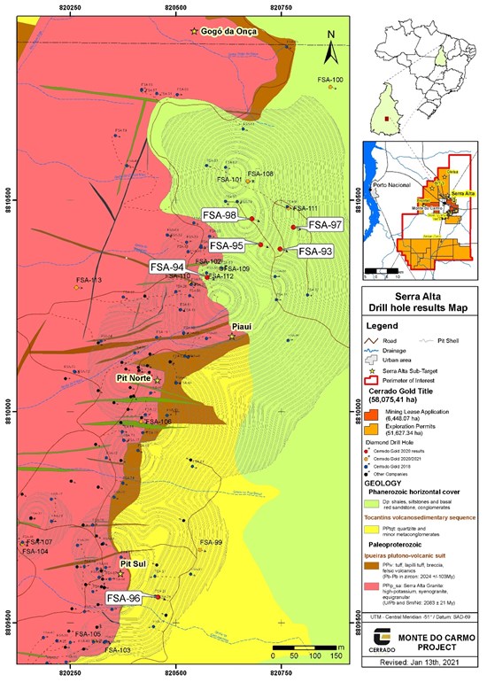 Toronto, Ontario–(Newsfile Corp. – January 14, 2021) – Cerrado Gold Inc. (“Cerrado” or the “Company”) is very pleased to announce drill results from six (6) drill holes from its ongoing 17,000-metre definition drilling program at the Serra Alta deposit, at its Monte do Carmo (“MDC”) Project located in Tocantins State, Brazil. The drill results highlighted in this release are from drill holes FSA93 thru 98, with more drill results to be announced as assays are made available over the next few months. This release follows the initial release of the results from FSA94 in December 2020 (December 16, 2020) of 105 metres grading 3.48g Au/t.
